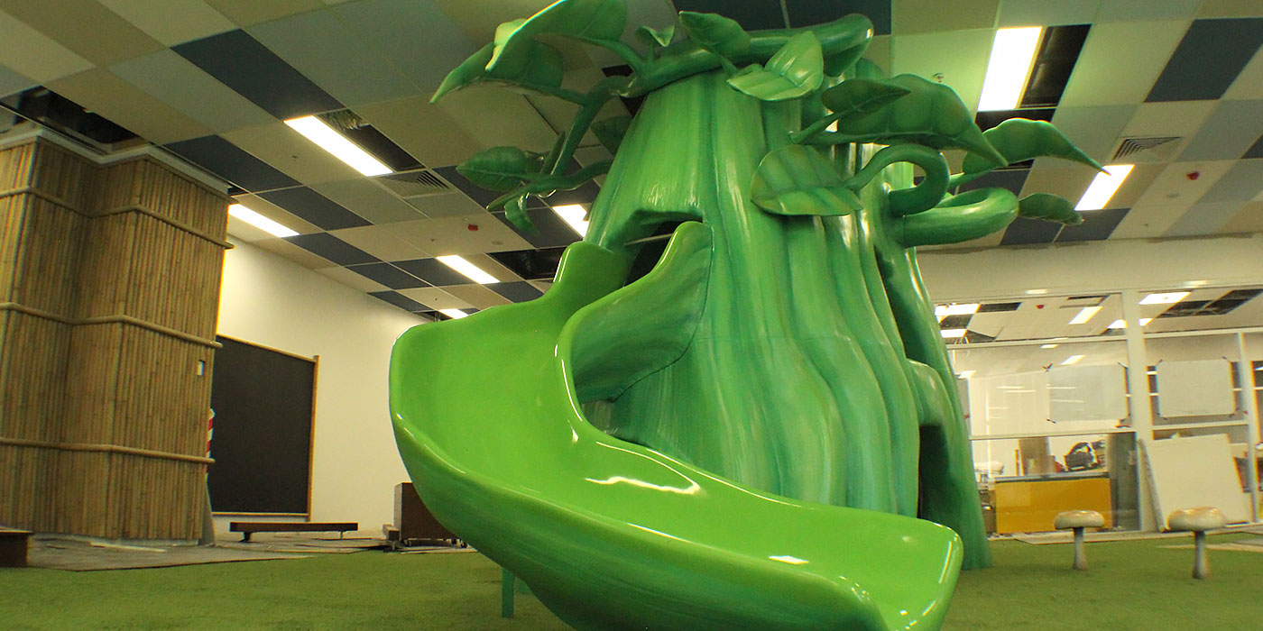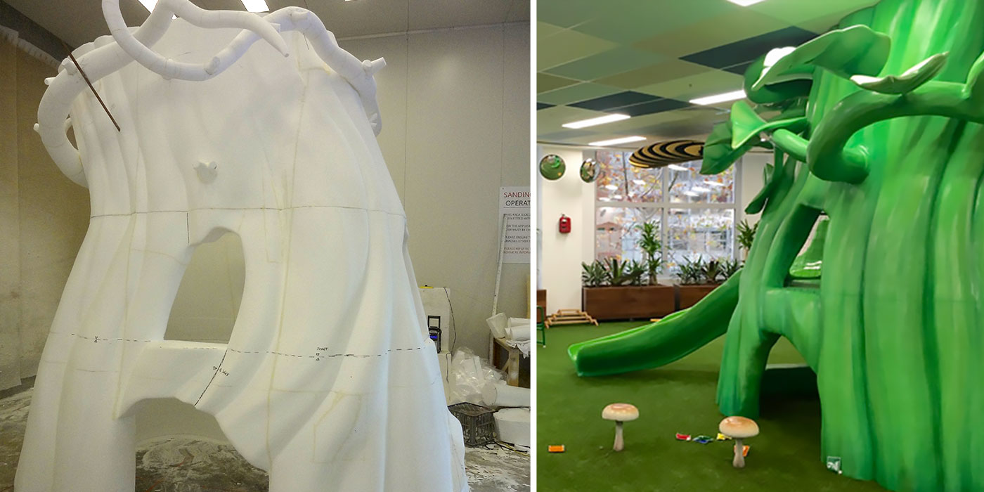 Greenleaves turned to us for the concept, design, fabrication management and safety certification of this fantasy forest slide. Besides its pea-pod slide, the tree harbours secrets including a ground-level play cubby, cobweb climbing net, upper-level play cubby with windows and a slide entry, and magical toad-stools dotted around the base of the tree-trunk for those who want to sit and watch the fun.