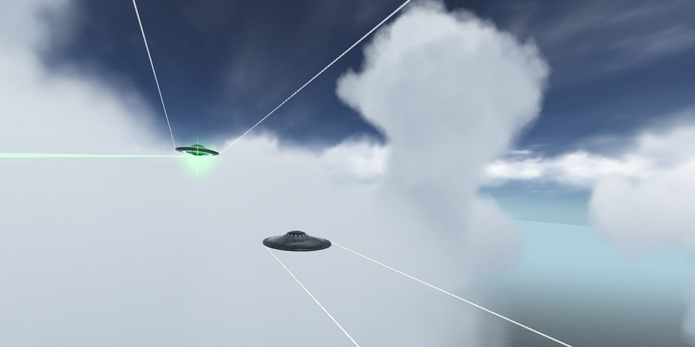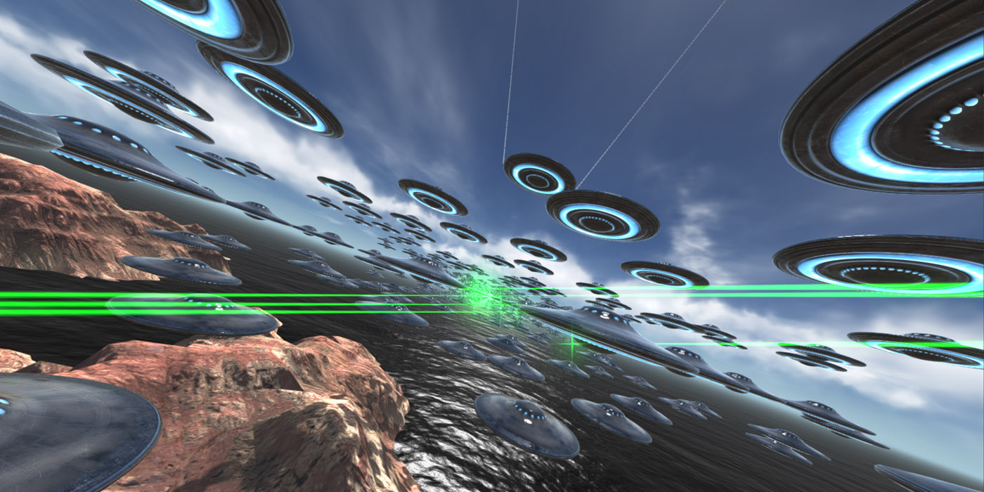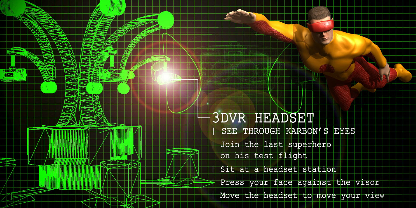Visitors seat themselves in front of a headset unit supported weightlessly by a set of arms that form nested sweeping curves. Six degrees of freedom are provided at the headset, with fully responsive real-time rendering of the computer-generated view when looking in any direction. The high-speed UFO aerial dogfights and chase scenes play out as an adrenaline-packed action movie complete with scored soundtrack, voice-over and sound effects, plus the added "wow" factor of 3D and immersive virtual reality.