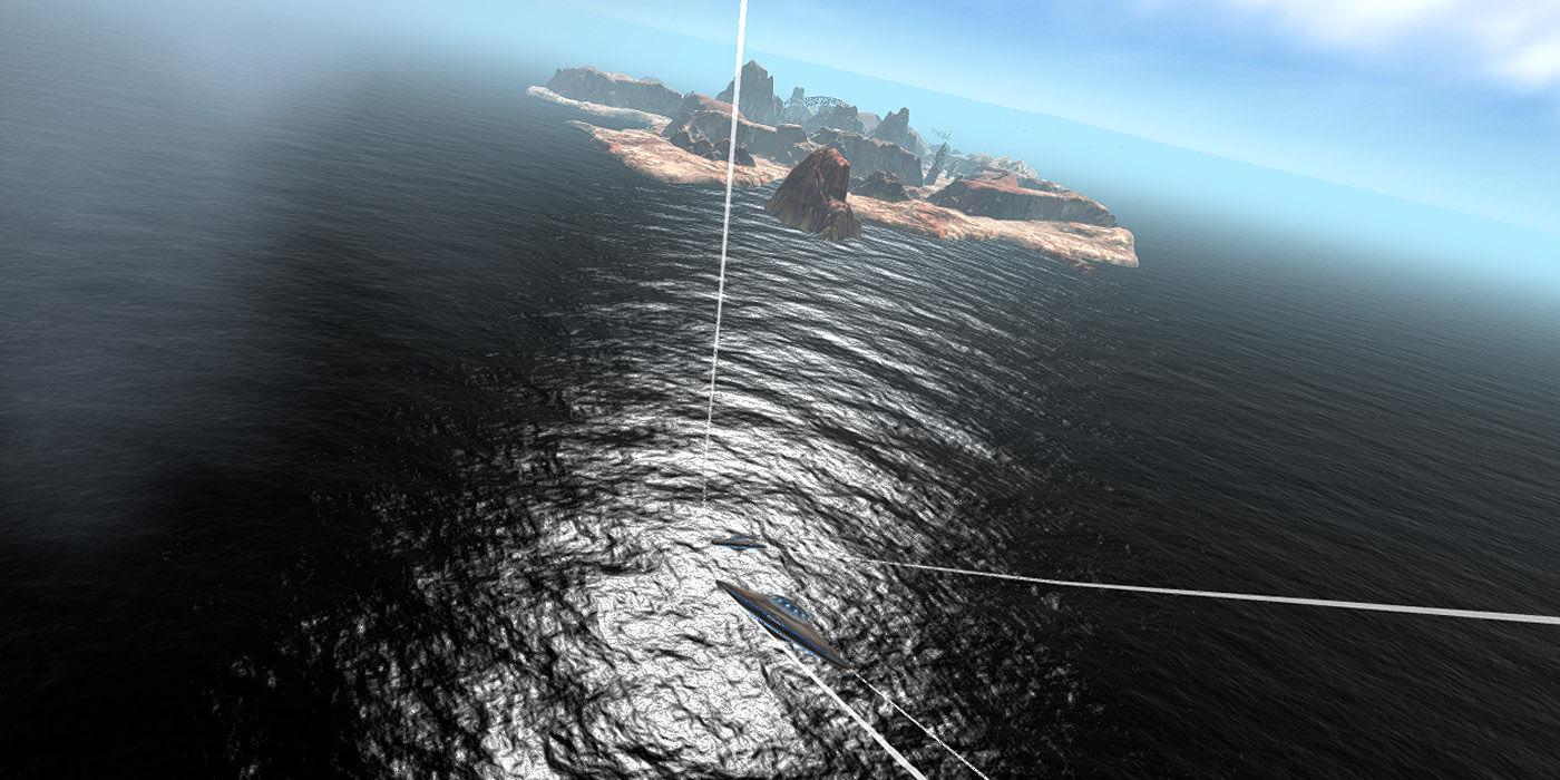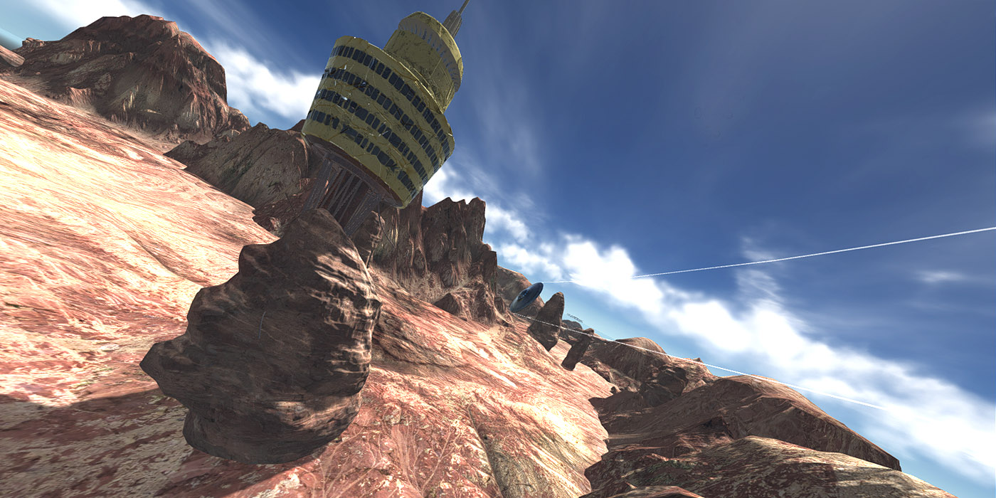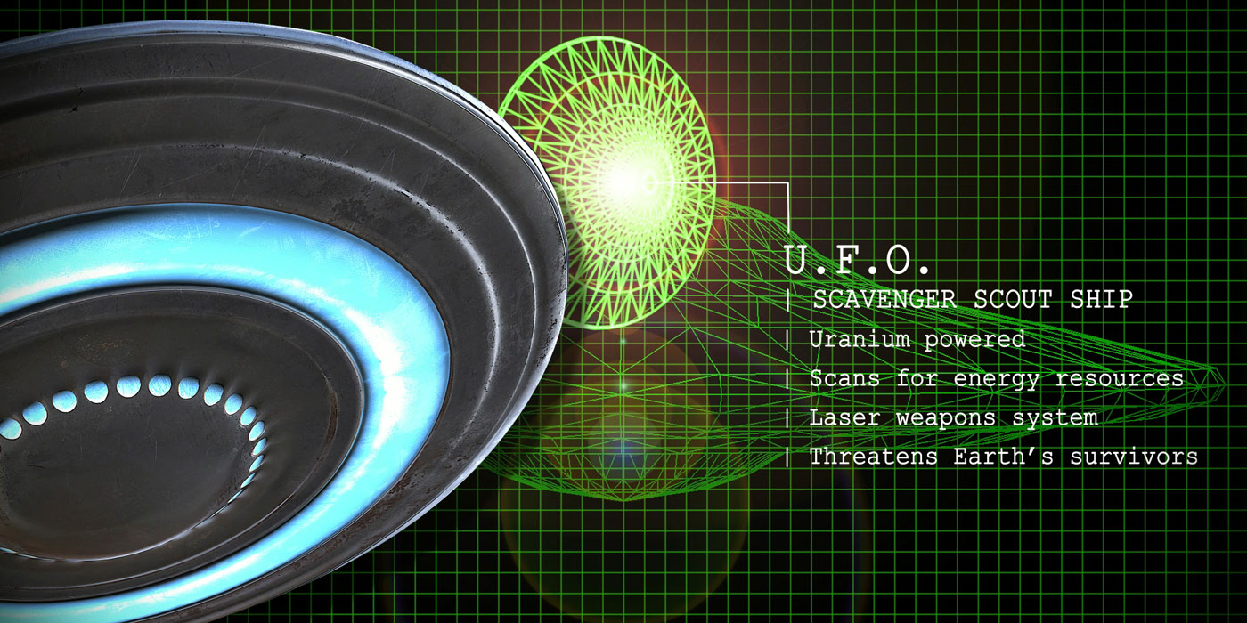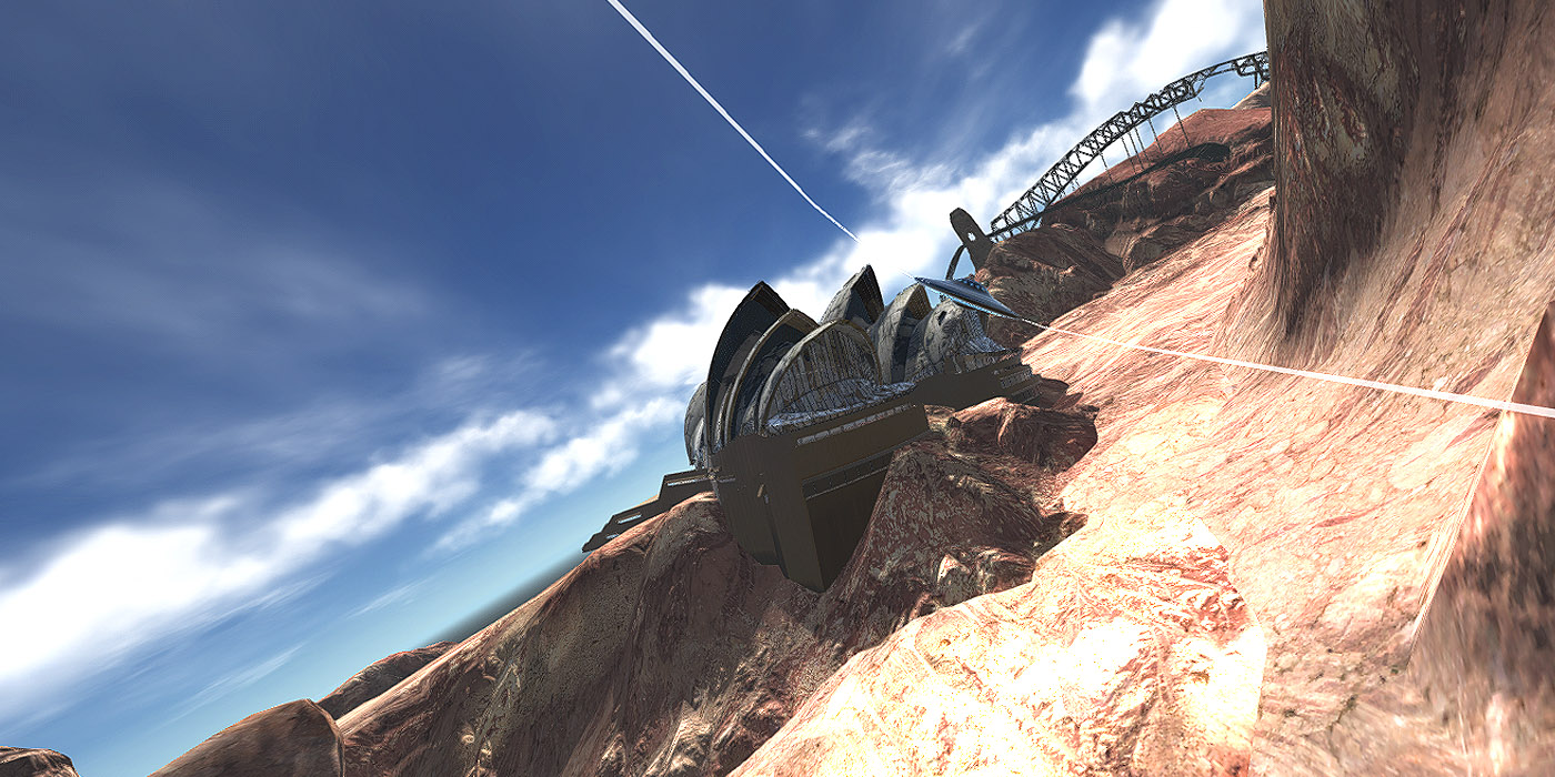 Visitors seat themselves in front of a headset unit supported weightlessly by a set of arms that form nested sweeping curves. Six degrees of freedom are provided at the headset, with fully responsive real-time rendering of the computer-generated view when looking in any direction. The high-speed UFO aerial dogfights and chase scenes play out as an adrenaline-packed action movie complete with scored soundtrack, voice-over and sound effects, plus the added "wow" factor of 3D and immersive virtual reality.
