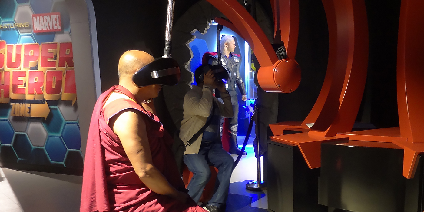 Previous challenges to public interaction with 3DVR headsets in a themed attraction environment were overcome by way of a number of Earthstory software and hardware design innovations. Issues of staffing, hygeine, security and health were all addressed in this unique suite of solutions.