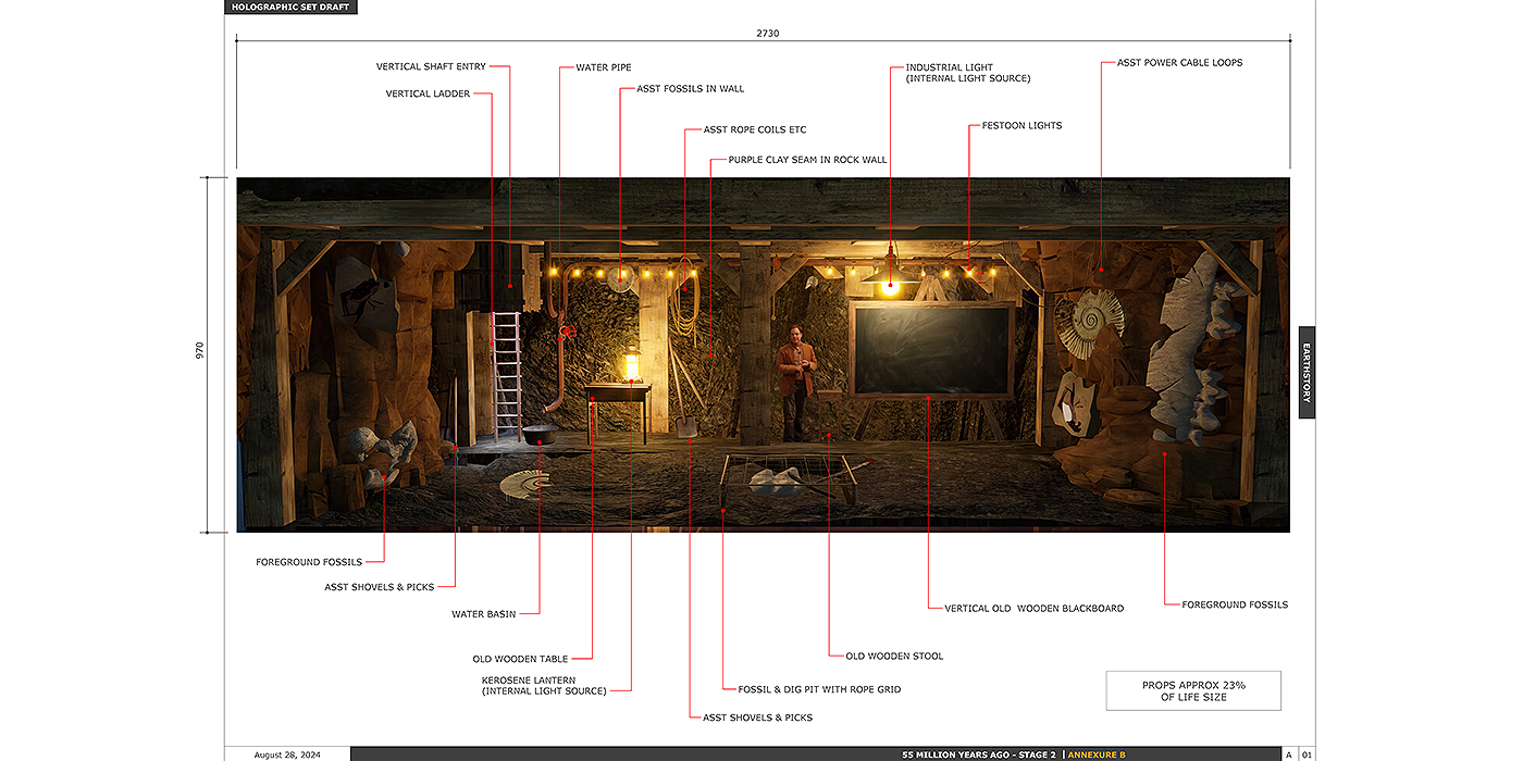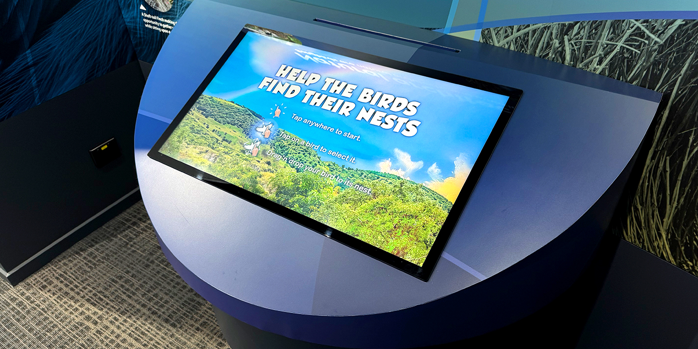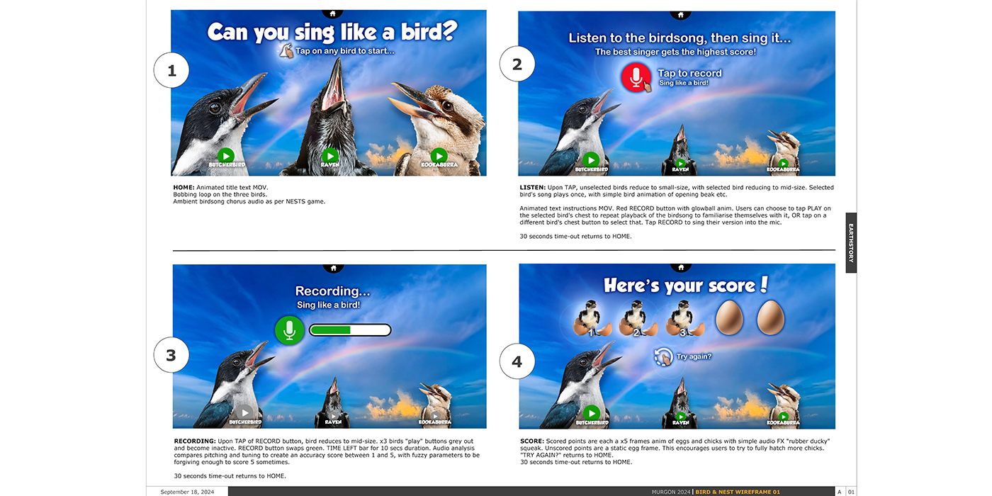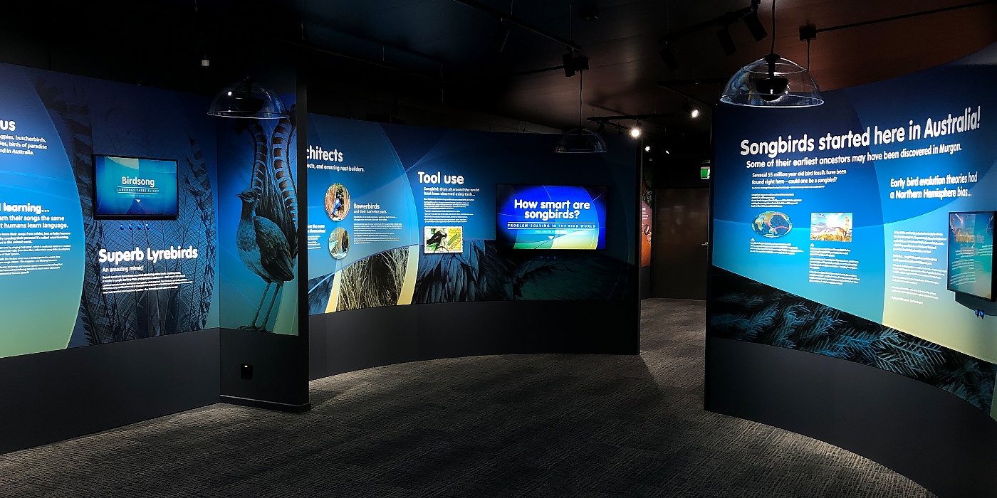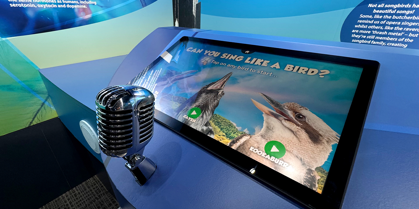 Stage 2 of the project saw us return to create unique and engaging multimedia interactives - a large-scale hologram of Professor Mike Archer walking us through the amazing discoveries that lie in wait below the surface; a voice-matching game of "Can You Sing Like a Bird?"; and a drag'n'drop game of "Find the Nest" to help your chosen bird fly to its own nest within the Boat Mountain landscape!