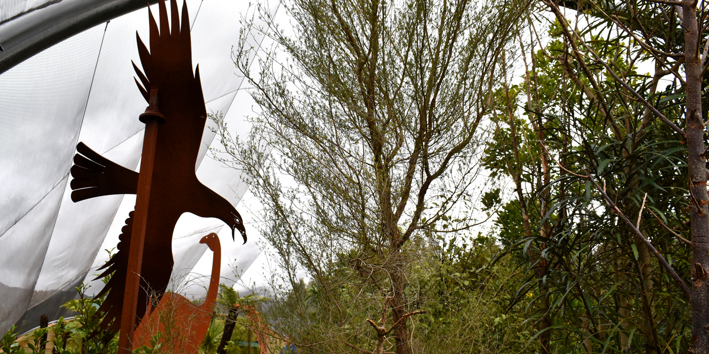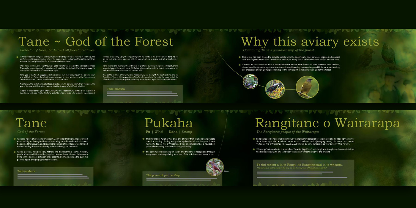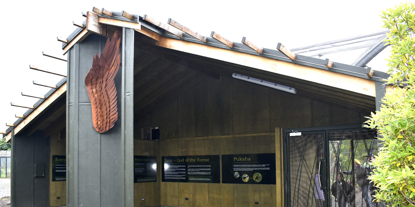 For this addition to the attractions at Pukaha Mount Bruce Wildlife Centre (Wairarapa, New Zealand), Earthstory provided cultural liaison and writing of the Rangitane iwi's content, commissioned massive mild-steel sculptures by local artist Mark Dimock, and designed and print-managed the overall interpretive content. We also provided the media delivery systems for cultural audio of the 'Waiata manu Huia' (Song of the Huia), a Rangitane lament to one of Aoteoroa's most beautiful now-extinct native birds.